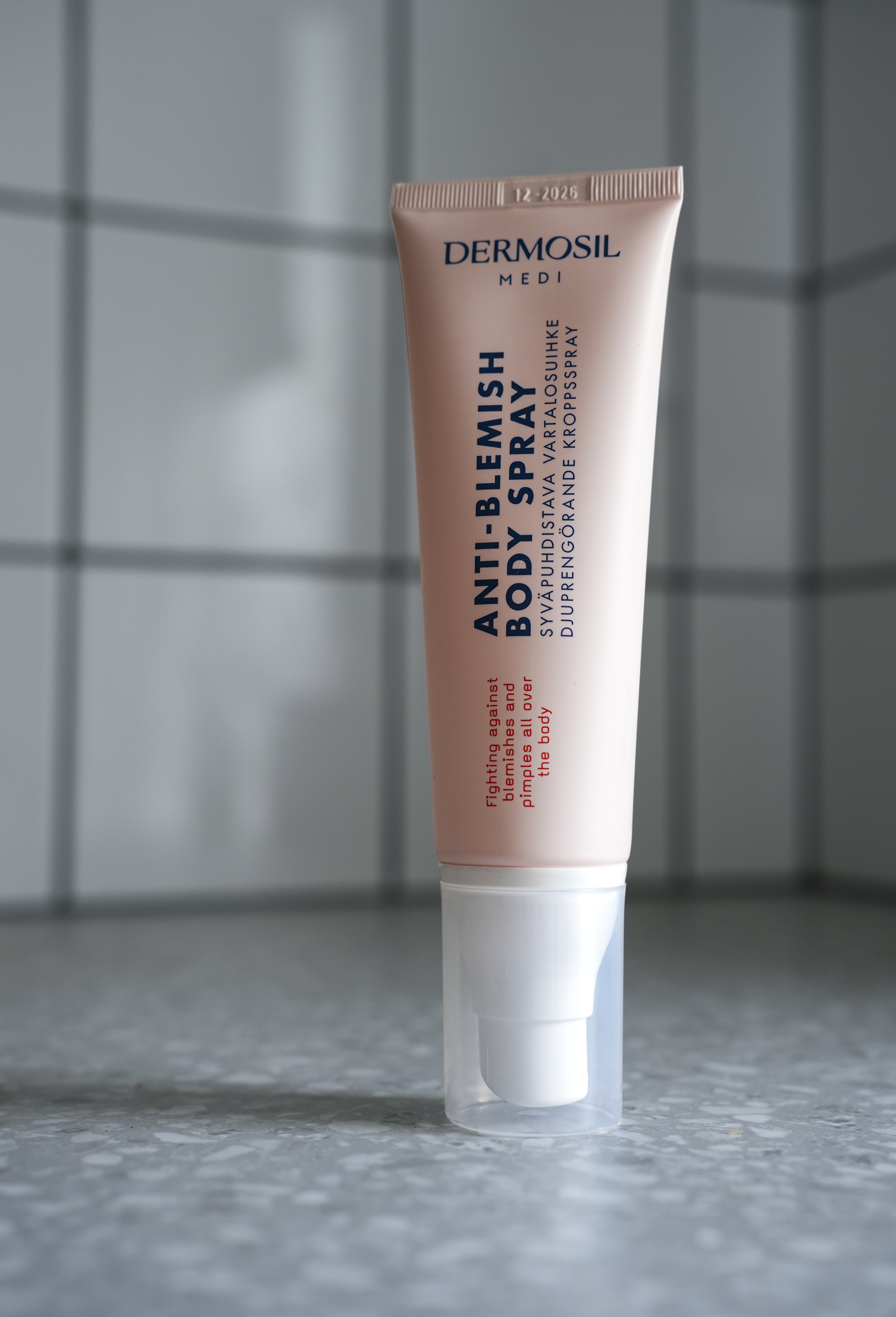 Anti-Blemish Body Spray is packaged in a convenient tube that is great for spraying the product for example on your back. The pump works in any direction.