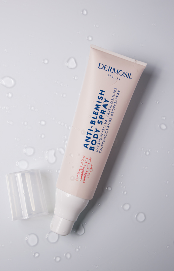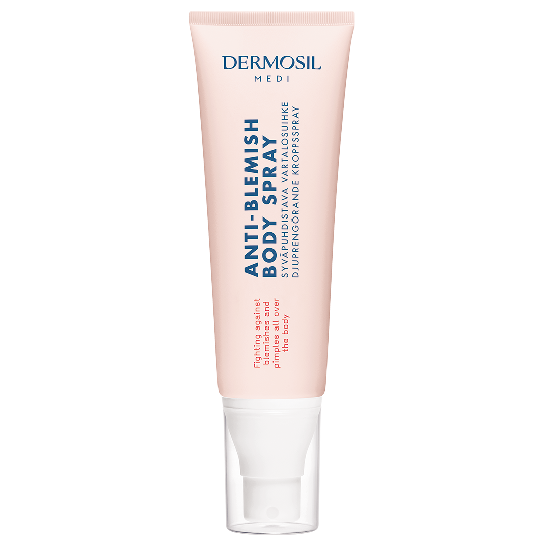 Anti-Blemish Body Spray helps to prevent pimples and other impurities anywhere on your body, like on the back. The body spray contains effective salicylic acid that peels dead skin cells and makes room for healthy skin. Salicylic acid also helps to soak oil out of pores.