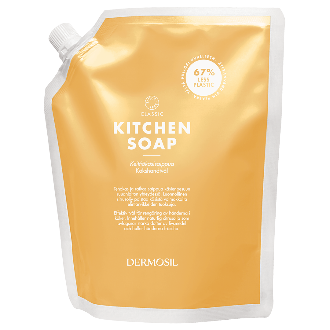 Kitchen Soap cleanses hands thoroughly. The product contain natural citrus oil for its fresh fragrance, which effectively removes for example the smell of fish or onions.
