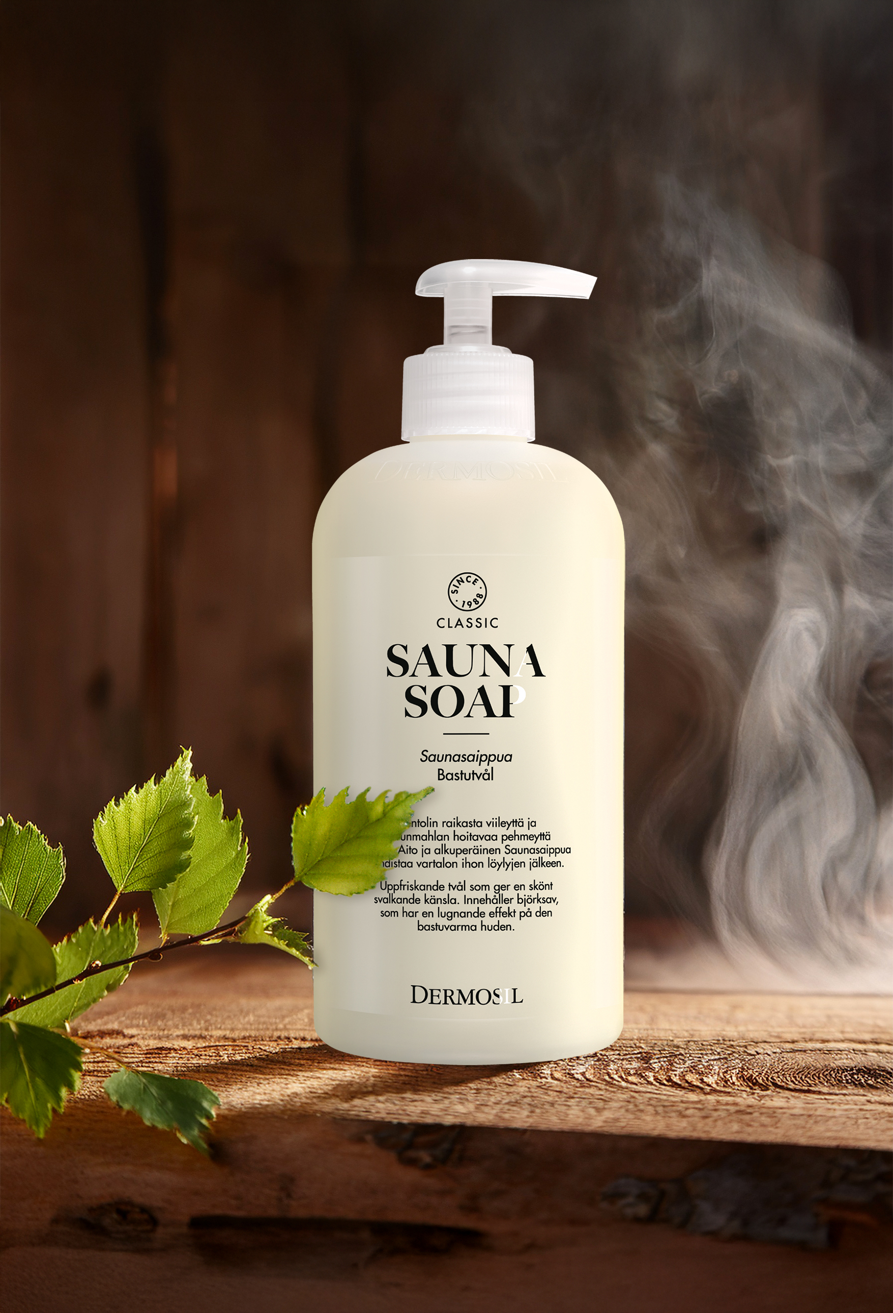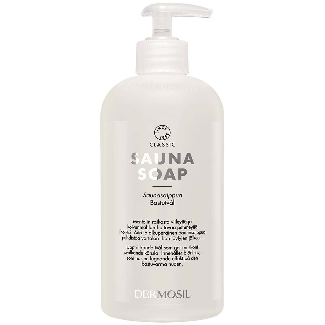Dermosil Sauna Soap is a liquid soap in the familiar 500 ml pump bottle. The soap contains menthol which creates a pleasant cool feeling and the birch sap has a soothing effect on skin flushed and warm from the sauna.