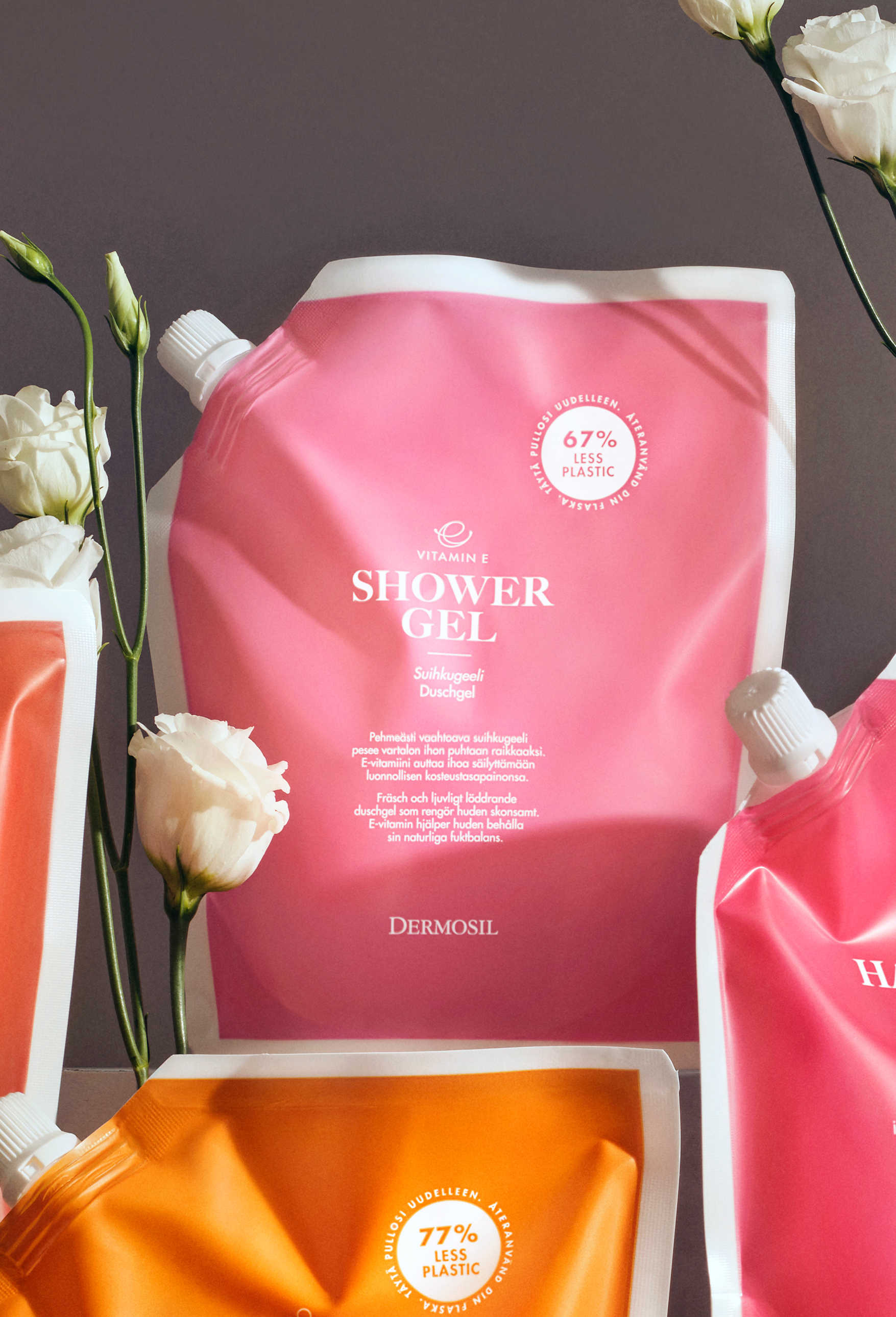 The refill bag is made of PET/PA/PE plastics and the cap is made of PP plastic. The refill uses notably less plastic and takes up much less space in the waste bin. The Dermosil refill bag is an environmentally friendly choice. Emptied Dermosil refill bags can be disposed with kitchen waste.