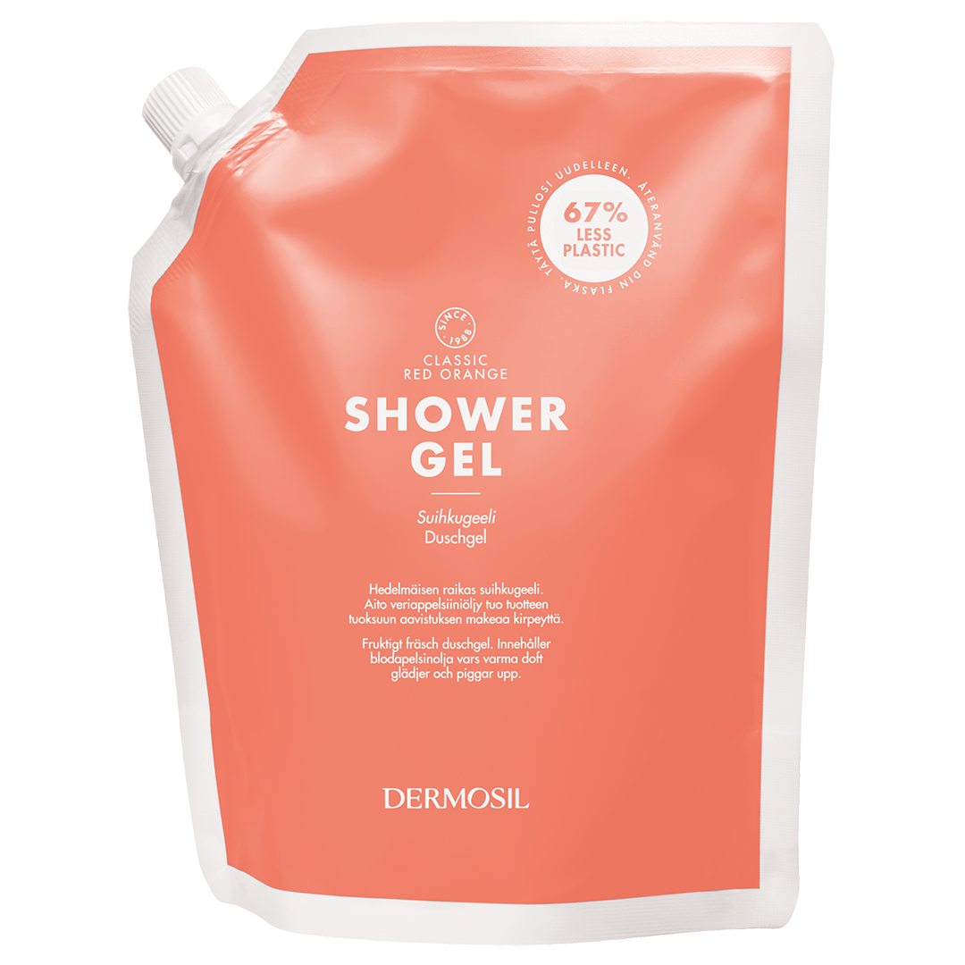 The refill bag is made of PET/PA/PE plastics and the cap is made of PP plastic. The cap has a seal made of aluminium. An empty refill bag with cap weighs 13 grams; an empty 500 ml bottle and pump together weigh 46 grams. Therefore the refill uses notably less plastic and takes up much less space in the waste bin. The Dermosil refill bag is an environmentally friendly choice. Emptied Dermosil refill bags can be disposed with kitchen waste.