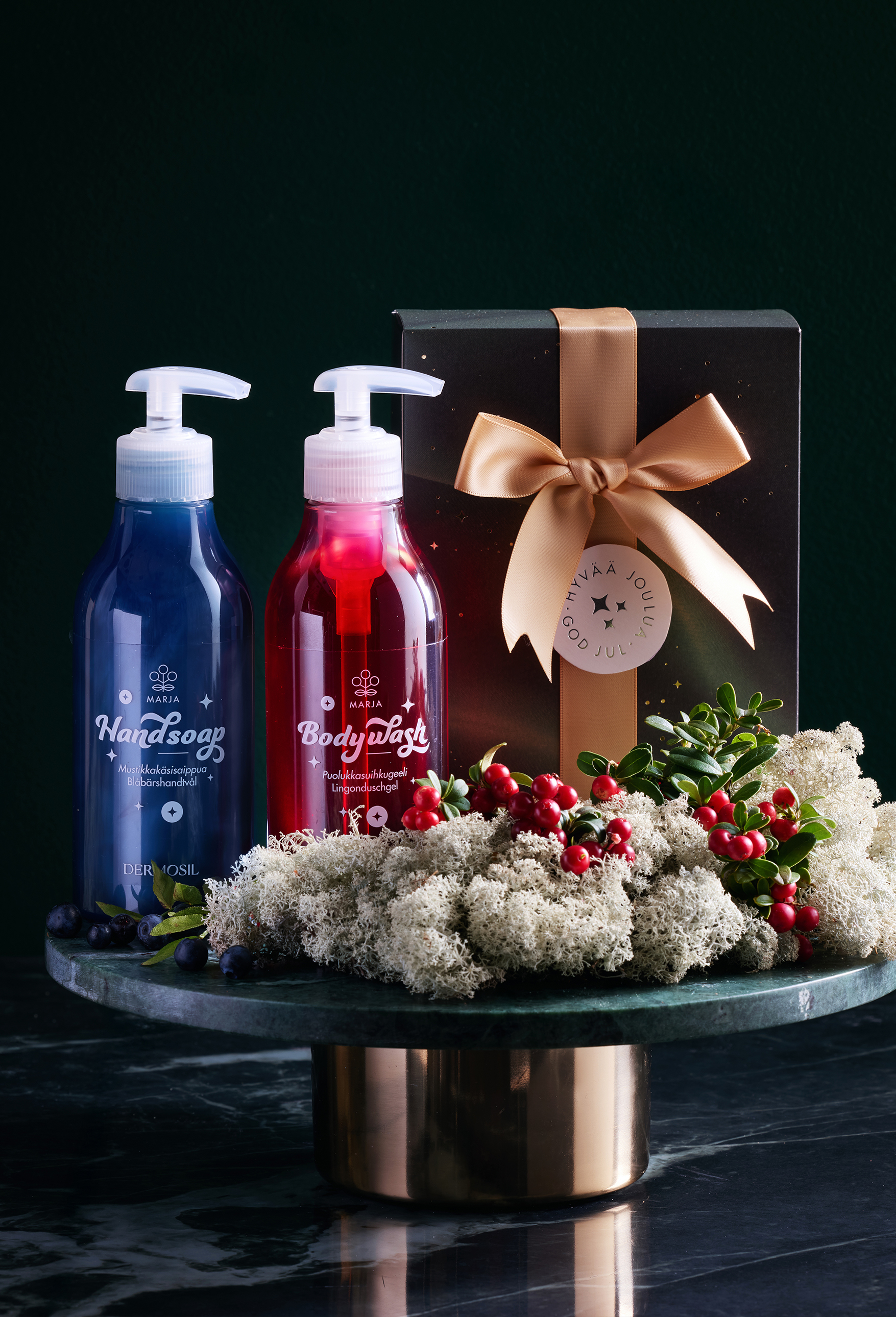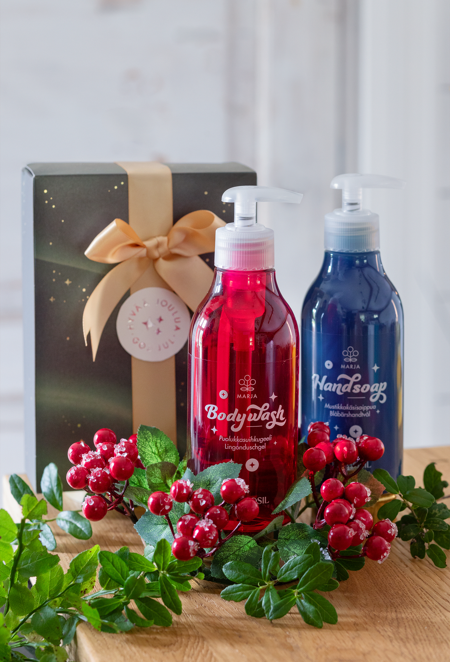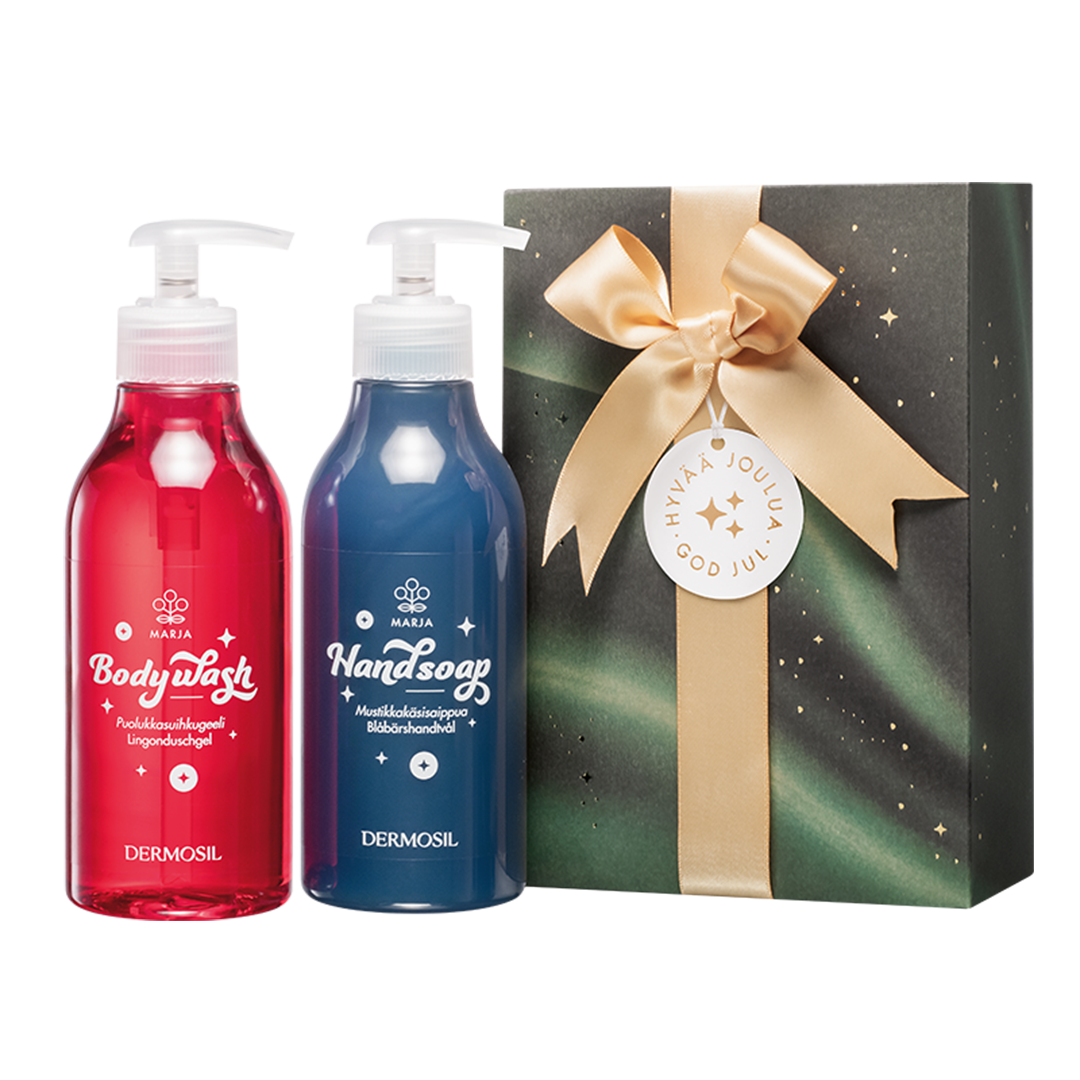 Christmas gift Berry contains treasures of the Finnish forests: Lingonberry Body Wash and Blueberry Hand Soap. The products with juicy berry flavours are made in our own factory in Finland and the luxurious bottled contents are rich in genuine blueberry and lingonberry seed oils.