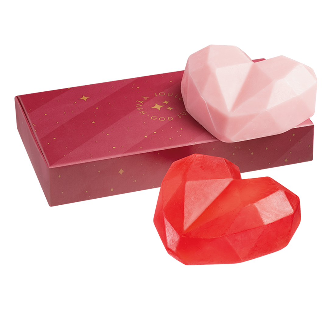 Two vegan heart-shaped soaps delivering warmth and softness to your hand-washing moments. A lovely gift for the festive season.
