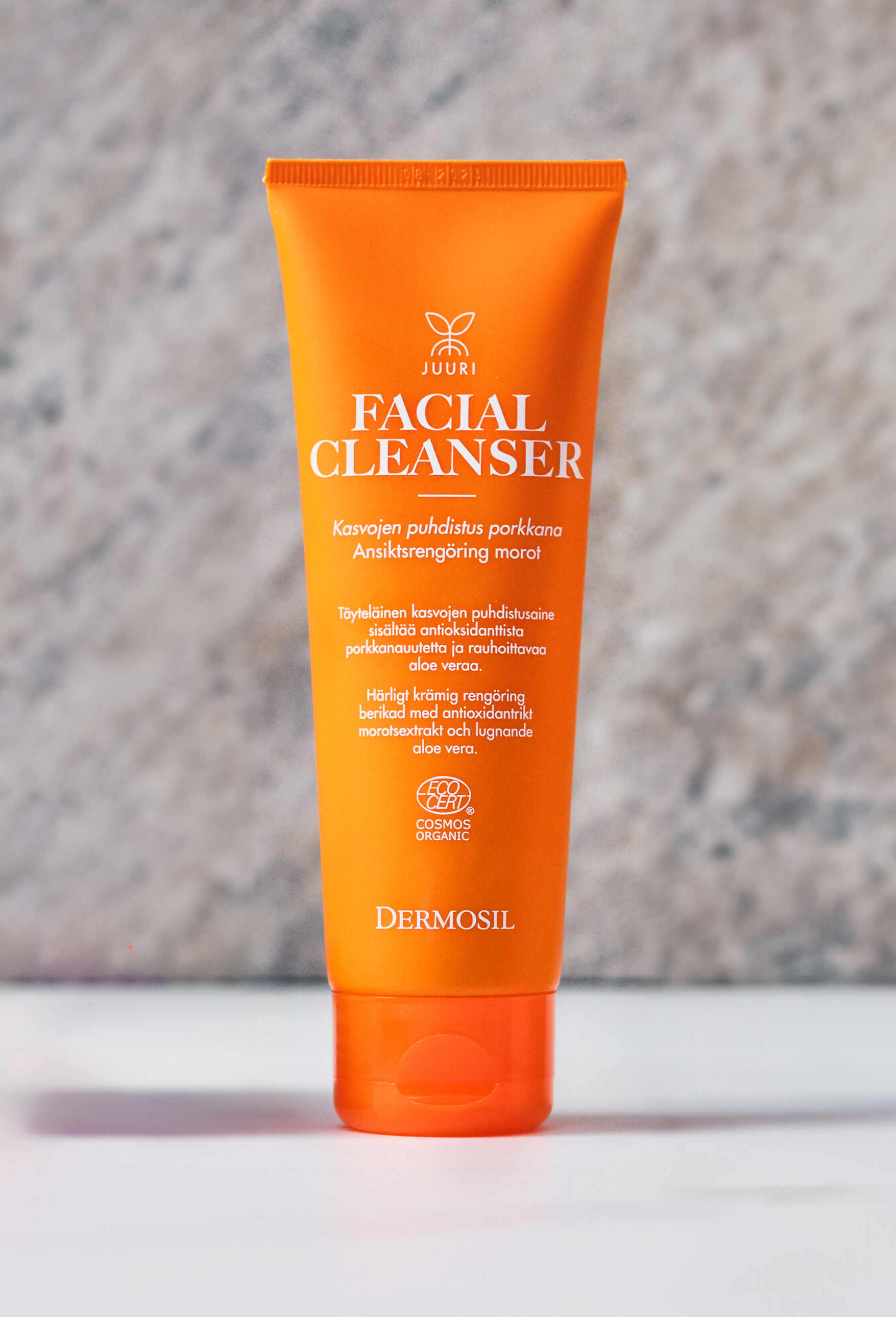 Carrot Facial Cleanser is a natural cosmetic product certified by Ecocert Cosmos Organic. 99.3 % of its components are of natural origins and 43 % are organic. The product is packaged in a container made of recycled plastic.