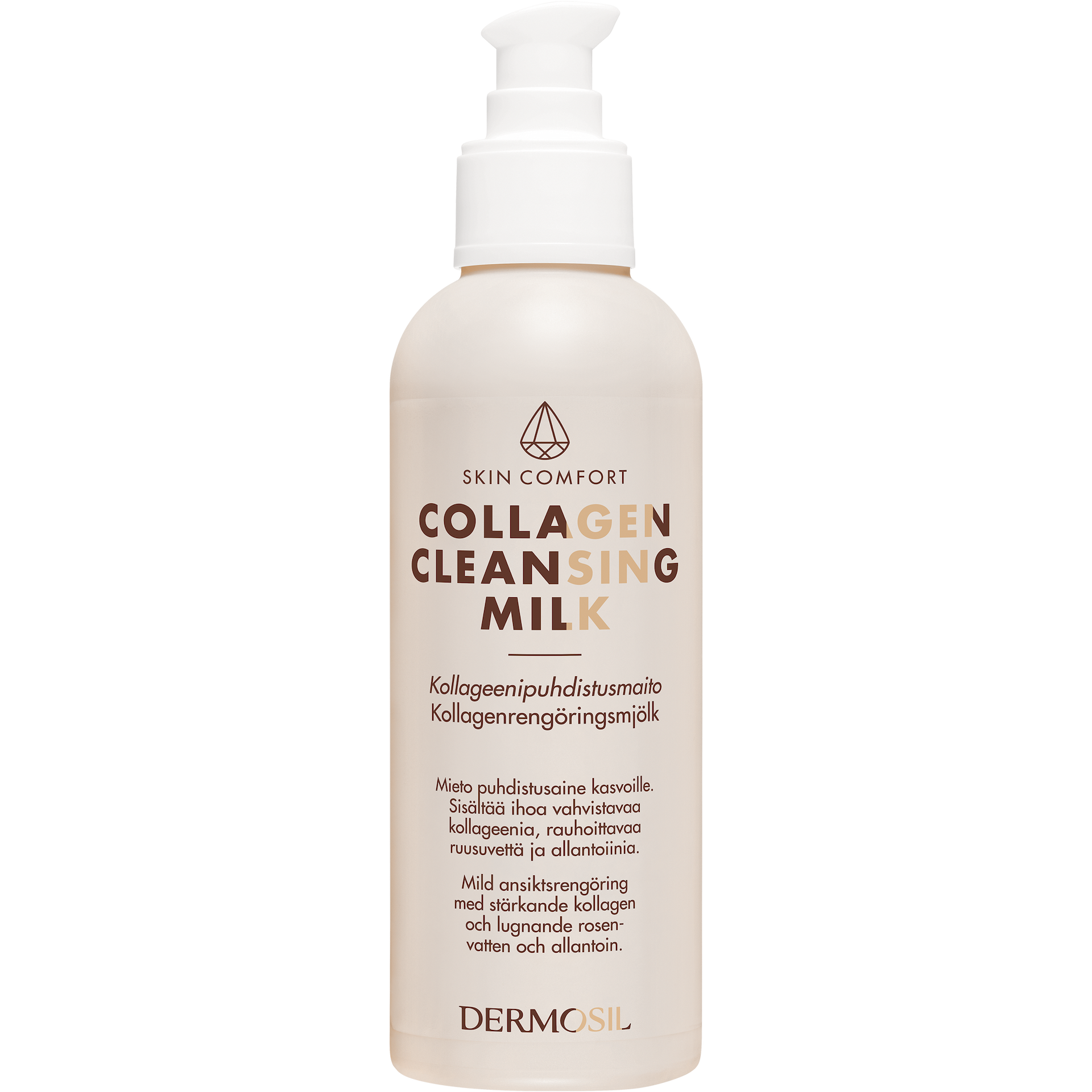 Massage some cleansing milk lightly on dry face and neck, then rinse with lukewarm water or wipe the cleansing product off with a cotton pad. Use Collagen Cleansing Milk mornings and/or evenings. To finish the cleansing, use Collagen Facial Tonic and a day or night cream that suits your skin.