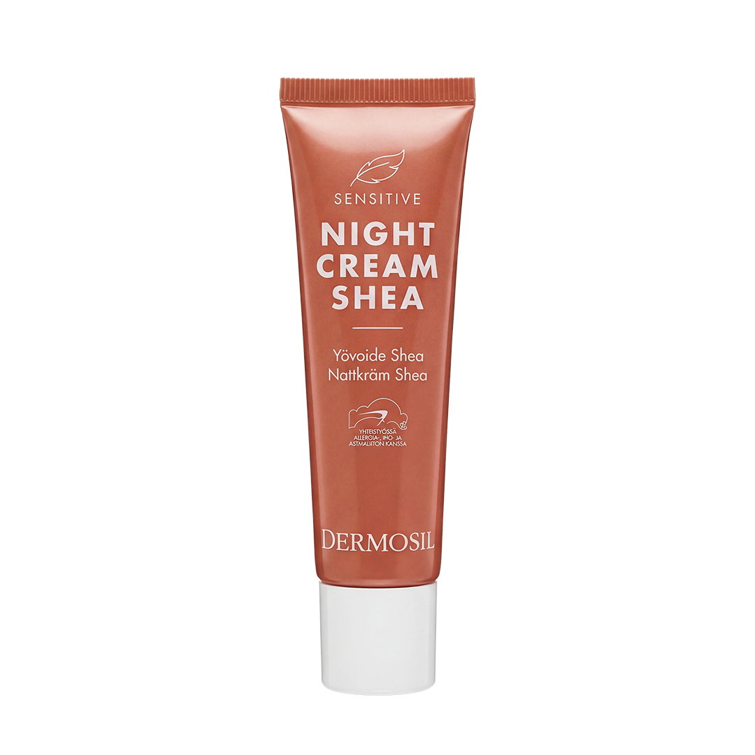 Sensitive Night Cream Shea is an extra rich and moisturising night cream for the face. Night Cream moisturises and provides skin care, helping to renew skin over the night. In the morning skin feels perfectly soft and moisturised. A handy travel-size essential that’s easy to take with you wherever you go.