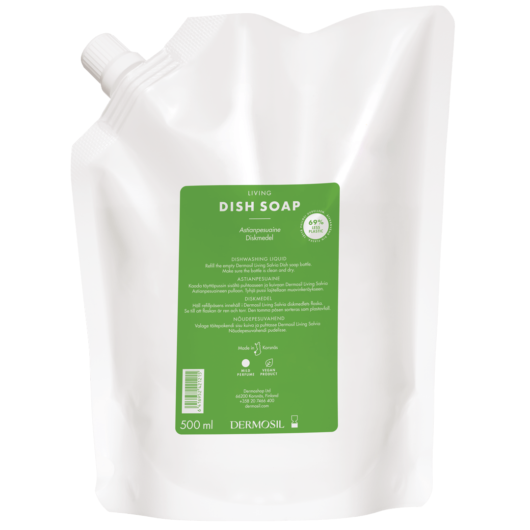 With Salvia Dishwashing Liquid, you’ll get your dishes sparkling clean! The fresh, herbal fragrance is the same as in the popular Salvia kitchen hand soap. With the 500 ml refill pouch, you can easily refill your bottle.