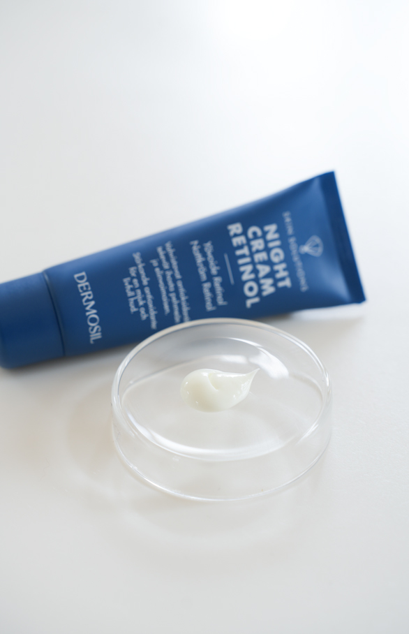 Dermosil Night Cream Retinol is rich in moisturising skin care components and antioxidants. Retinol is vitamin A. In addition the cream contains vitamin E and C. These are all antioxidants that are important to skin, they help skin to protect itself from free radicals and support cell function. This way antioxidants help prevent the signs of aging. The cream contains moisturising seaweed extract with skin care properties, soy oil and glycerine.